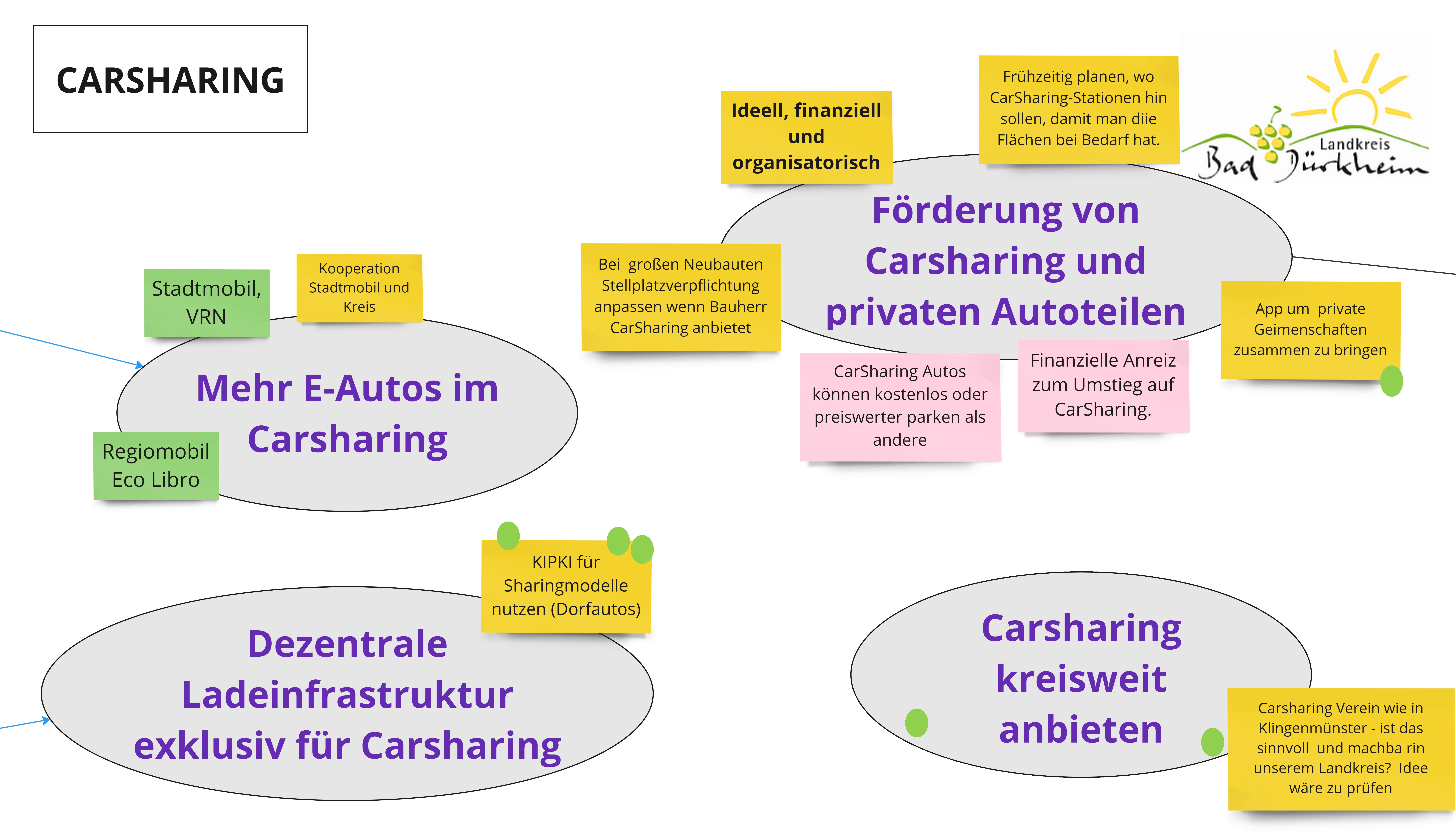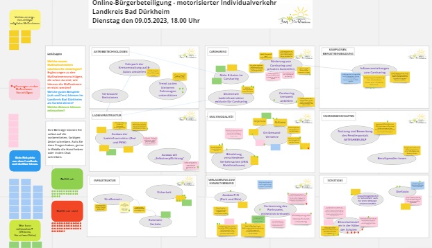 Wichtiger Bestandteil der virtuellen Bürgerbeteiligung war wieder eine Art interaktive, digitale Tafel – Miro-Board genannt. Über Webex erhielten die Teilnehmer einen Link zur Tafel und können an dieser virtuelle Notizzettel beschriften und per Maus zu passenden Themen „kleben“. Rote und grüne Punkte können als Meinungsbekundung für „gefällt mir nicht“ oder „gefällt mir“ an Ansätze geheftet werden. Das Board ist anonym, sodass jeder ohne Befürchtungen seine Ideen und Vorschläge einbringen kann. Nach der Arbeit am Miro-Board wurden Ergebnisse im Plenum zusammengefasst.