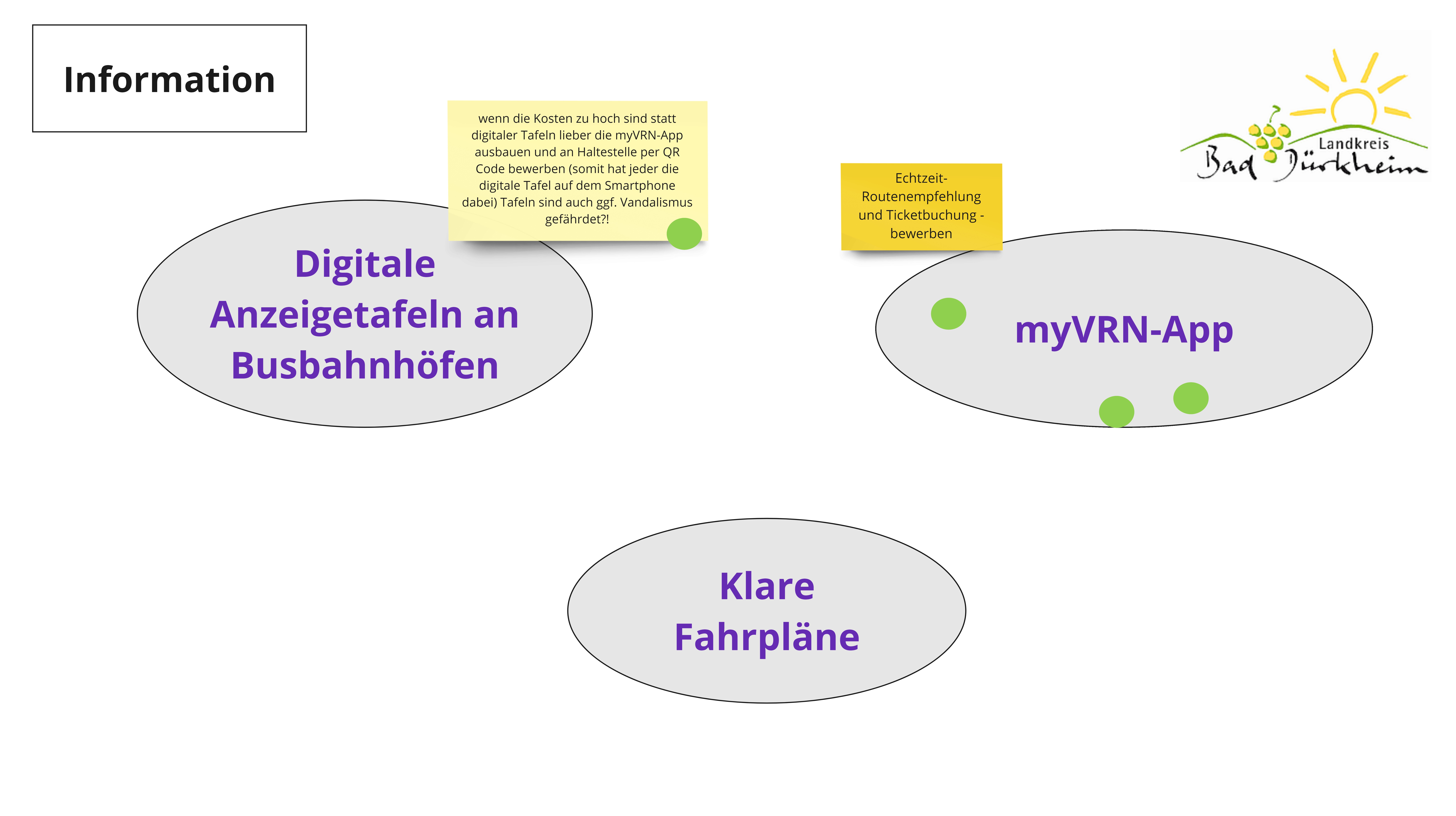 Wichtiger Bestandteil der virtuellen Bürgerbeteiligung war wieder eine Art interaktive, digitale Tafel – Miro-Board genannt. Über Webex erhielten die Teilnehmer einen Link zur Tafel und können an dieser virtuell Notizzettel beschriften und per Maus zu passenden Themen „kleben“. Rote und grüne Punkte können als Meinungsbekundung für „gefällt mir nicht“ oder „gefällt mir“ an Ansätze geheftet werden. Das Board war anonym, sodass jeder ohne Befürchtungen seine Ideen und Vorschläge einbringen konnte. Zudem war es jederzeit möglich, im Chat Fragen zu stellen. Nach der Arbeit am Miro-Board wurden Ergebnisse im Plenum zusammengefasst.